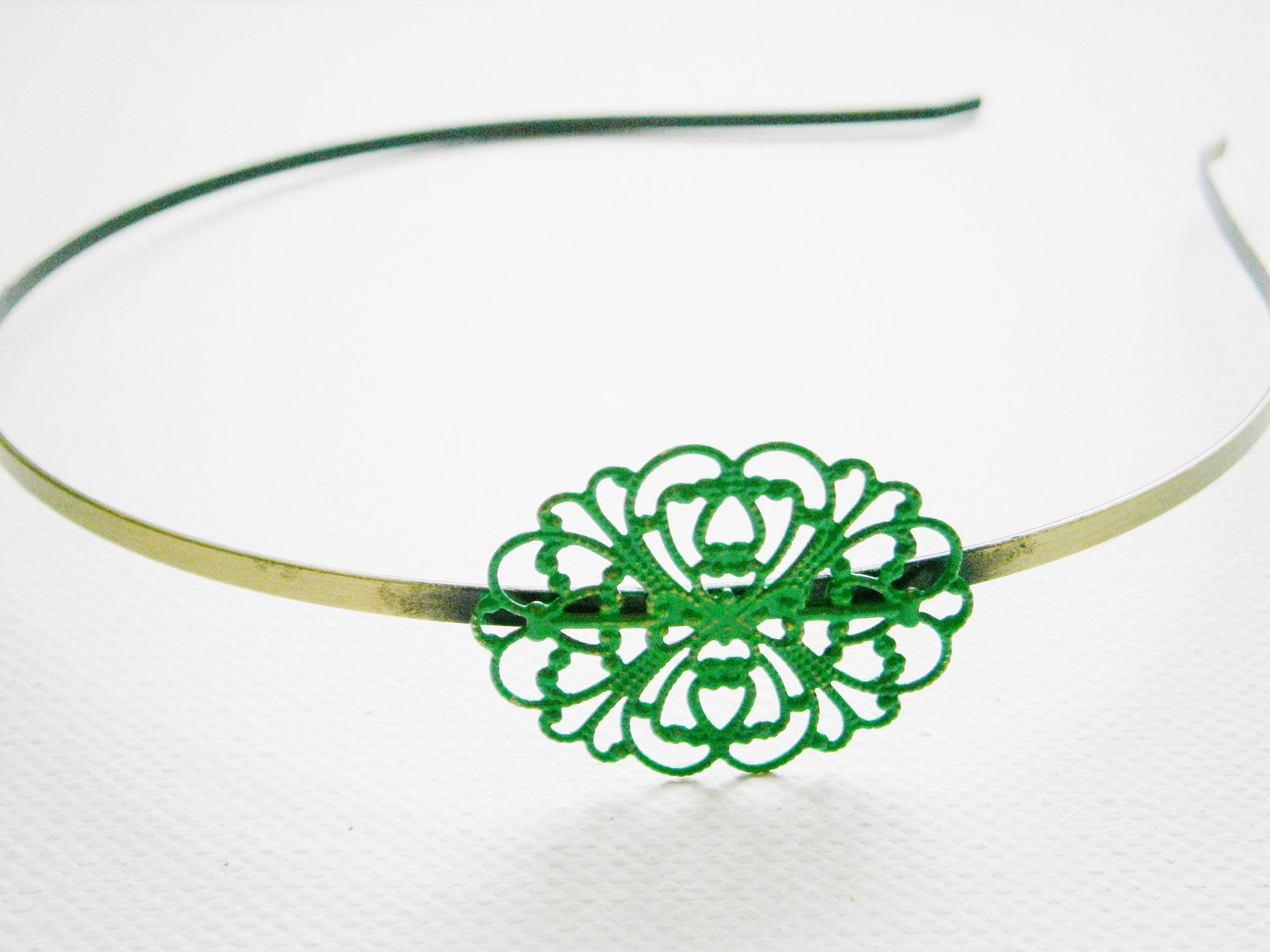 Vintage inspired antique bronze headband with a Emerald Green coloured patina filigree decal, made from a light metal that is strong but comfortable to wear. I hand finish patina these headbands then distress and seal them so the color's will last.