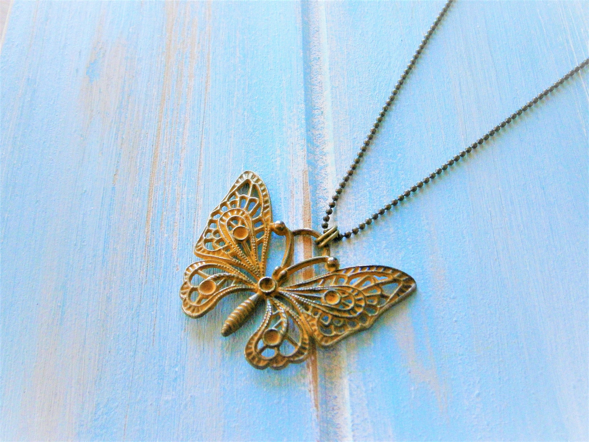 Ochre/Yellow Patina Filigree Butterfly on Antique Bronze Ball Chain/Boho Necklace/Long Necklace/Layering Necklace/Patina Necklace.