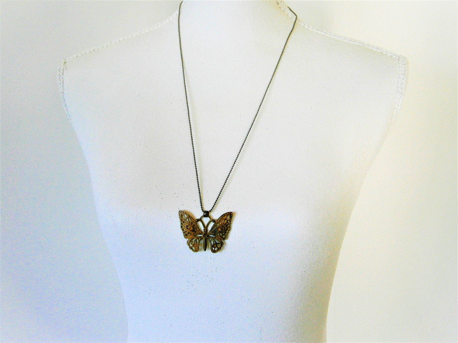 Materials: Ochre/Yellow Patina Filigree Butterfly 49mm x 48mm,Antique Bronze 1.55 Ball Chain Necklace approximately 70cm Long.
